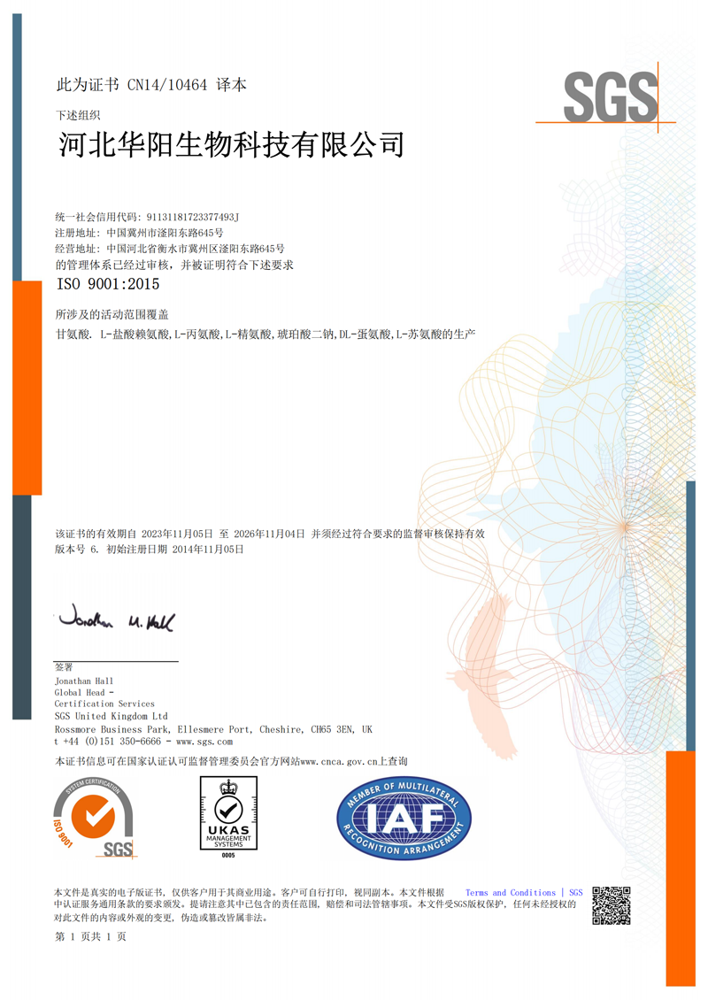河北華陽集團坐落于河北省衡水市冀州區省級工業園區(始建于1987年,前身為冀州市華陽化工有限責任公司)。集團下屬四個公司:河北華陽生物科技有限公司、河北華悅氨基酸科技有限公司、滄州華晨生物科技有限公司、衡水市陽力商貿有限公司。主要生產甘氨酸、L-丙氨酸、L-蘇氨酸、DL-蛋氨酸、L-賴氨酸鹽酸鹽、L-半胱氨酸鹽酸鹽、干貝素等氨基酸系列食品級產品,廣泛應用于食品、飲料、飼料等行業。......